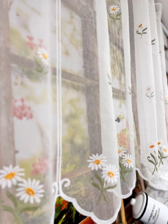 Zazdrostka „Stokrotka” to wyjątkowe połączenie delikatnej firanki i uroczego haftu, które nada Twojemu wnętrzu lekkości, świeżości i domowego ciepła.